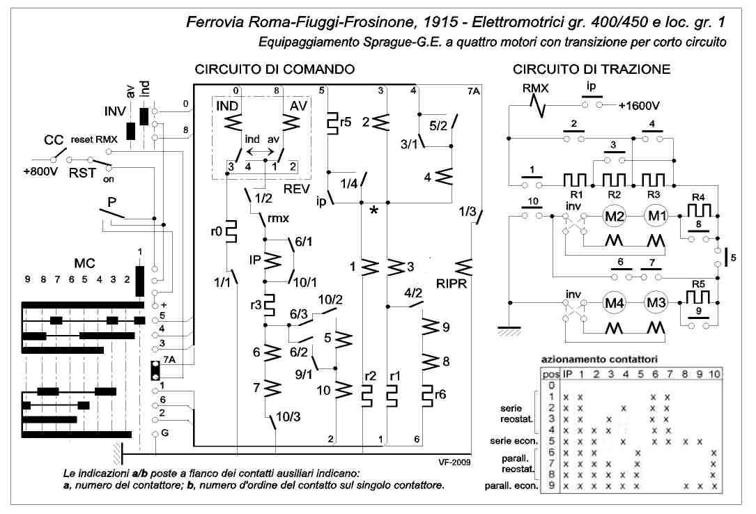 Lo schema del circuito di comando è riportato più sotto, con semplificazioni inessenziali; il circuito di comando è alimentato ad 800 V da un dinamotore.