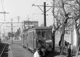Stazione di Centocelle, 1959: il primo treno urbano ricostruito a fianco di un vecchio convoglio.